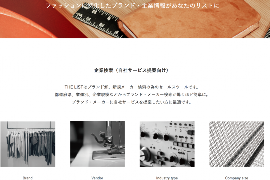 THE LISTはショップ検索に続き、企業・ブランド検索サービスをスタートしました。こちらはブランド卸、新規メーカー検索の為のセールスツールです。都道府県、業種別、企業規模などからブランド・メーカー検索が驚くほど簡単に。ブランド・メーカーに自社サービスを提案したい方に最適です。ご興味ある方はぜひお問い合わせください。
